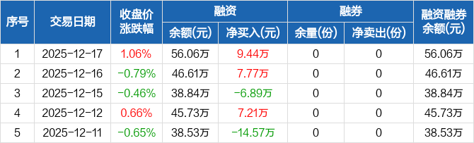 融資方面,當(dāng)日融資買(mǎi)入22.3萬(wàn)元,融資償還12.85萬(wàn)元,融資凈買(mǎi)入9.44萬(wàn)元。融券方面,融券賣(mài)出0份,融券償還0份,融券余量0份,融券余額0元。融資融券余額合計(jì)56.06萬(wàn)元。