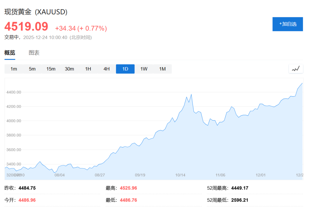 現(xiàn)貨黃金價(jià)格有史以來首次突破每盎司4500美元,今年以來已累計(jì)上漲超過三分之二,有望創(chuàng)下自1979年以來的最佳年度表現(xiàn)。