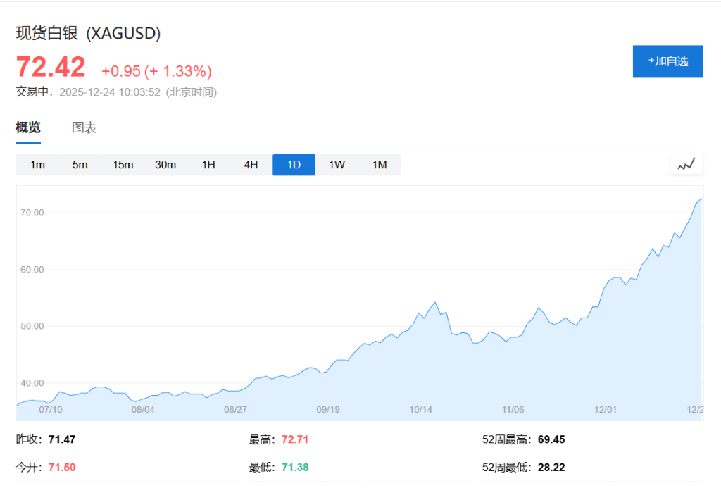 現(xiàn)貨白銀同樣漲勢如虹,突破70美元關(guān)口后,漲勢仍在強(qiáng)勢延續(xù)。