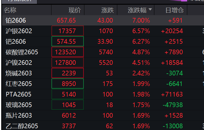 而這輪波瀾壯闊的漲勢正迅速傳導(dǎo)至全球市場。國內(nèi)商品期貨市場開盤后,鉑期貨主力合約觸及漲停,滬銀、鈀金期貨漲幅均超過6%。