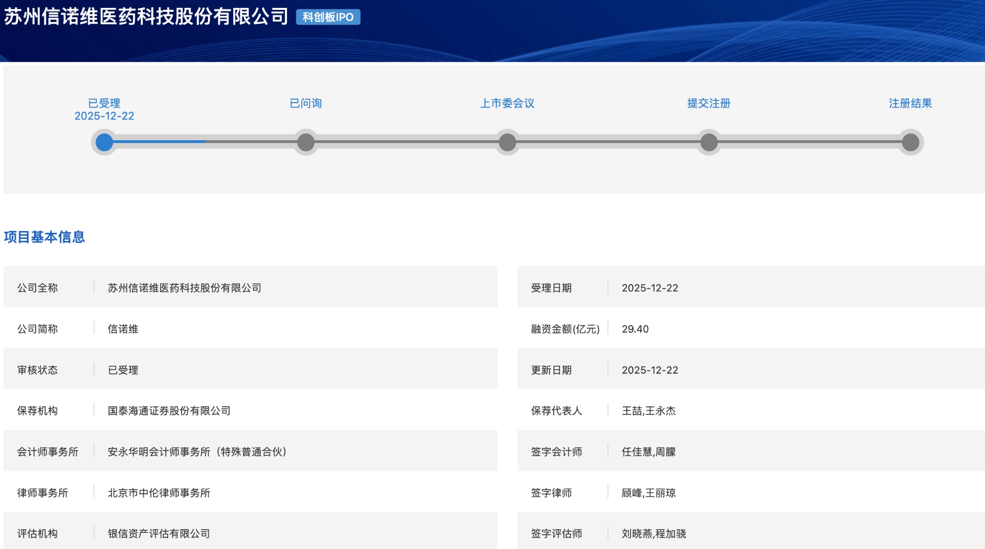 《科創(chuàng)板日報》12月24日訊(記者黃修眉)蘇州信諾維醫(yī)藥科技股份有限公司(下稱:“信諾維”)科創(chuàng)板IPO近日獲上交所受理,保薦機構(gòu)為國泰海通證券。
