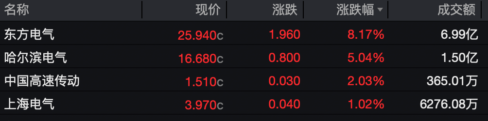 東方電氣漲超8%,哈爾濱電氣、中國高速傳動、上海電氣分別上漲5.04%、2.03%、1.02%。