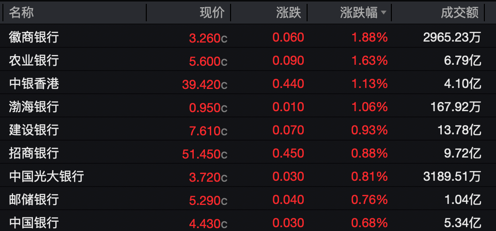 內(nèi)銀股普漲,徽商銀行、農(nóng)業(yè)銀行、中銀香港、渤海銀行漲幅均超1%。