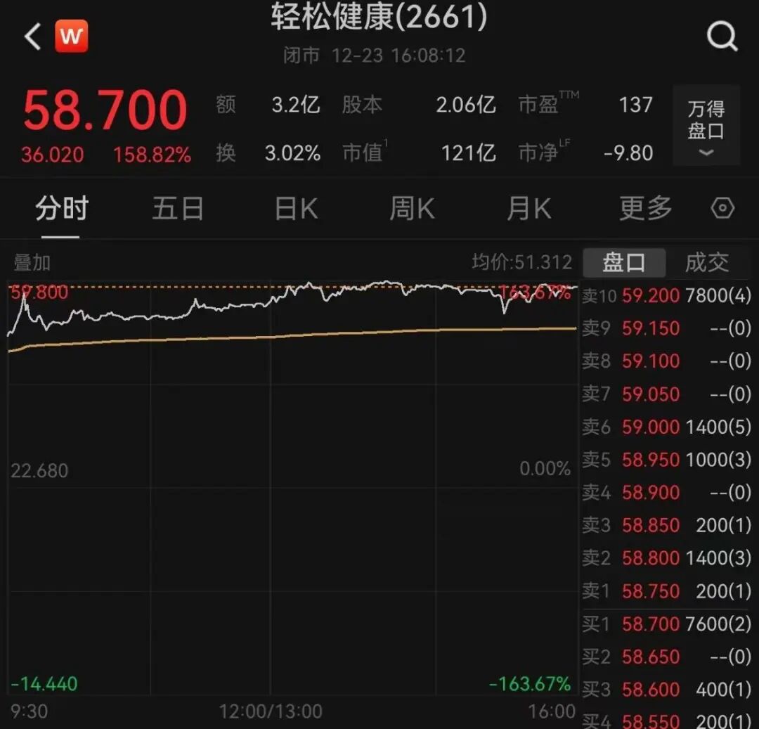 12月23日,輕松健康集團在港交所主板掛牌上市,收漲158.82%;在前一日的暗盤交易中收漲127.95%。