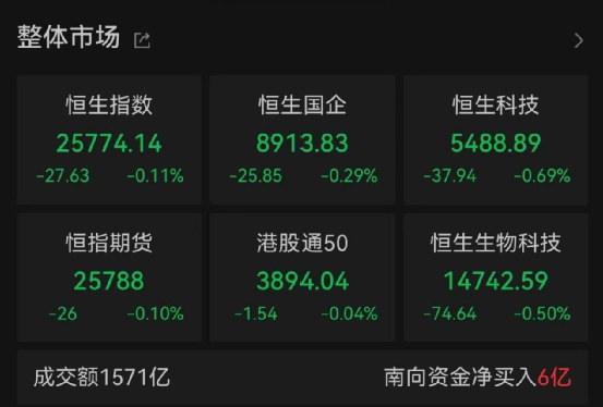 盤面上,科網(wǎng)股普遍下跌,有色板塊回調(diào);電氣、銀行板塊表現(xiàn)強勢。港股全市成交額為1571億港元,南向資金凈買入6億港元。