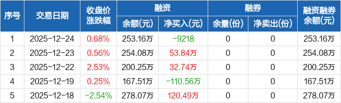 融資方面,當日融資買入52.61萬元,融資償還53.53萬元,融資凈償還9218元。融券方面,融券賣出0份,融券償還0份,融券余量0份,融券余額0元。融資融券余額合計253.16萬元。