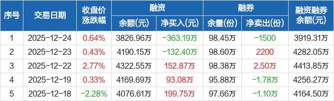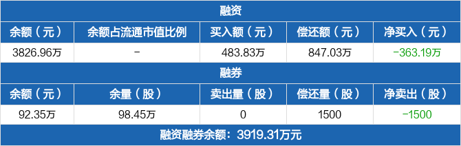 融資方面,當(dāng)日融資買入483.83萬元,融資償還847.03萬元,融資凈償還363.19萬元。融券方面,融券賣出0份,融券償還1500份,融券余量98.45萬份,融券余額92.35萬元。融資融券余額合計3919.31萬元。