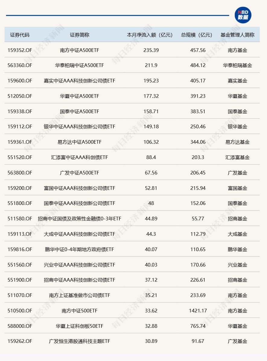 Wind數(shù)據(jù)顯示,在12月25日的非貨幣ETF市場(chǎng)中,銀華中證AAA科技創(chuàng)新公司債ETF基金份額增加0.35億份,凈流入額34.74億元;匯添富中證AAA科創(chuàng)債ETF份額增加0.20億份,凈流入額20.50億元;華泰柏瑞中證A500ETF份額增加12.09億份,凈流入額15.20億元。