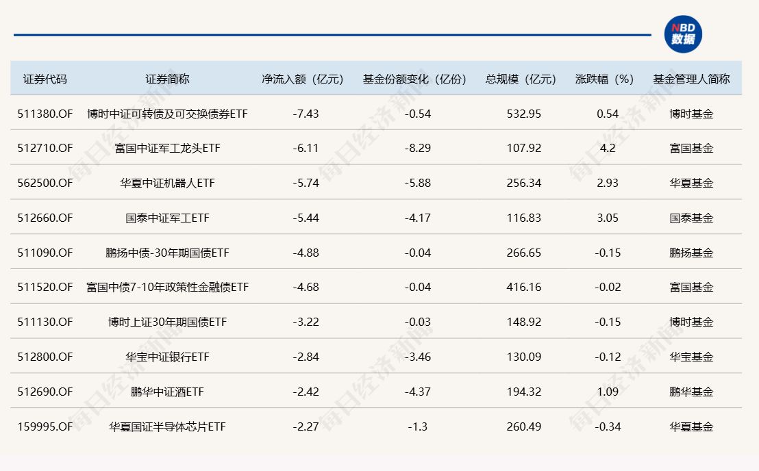 與此同時(shí),博時(shí)中證可轉(zhuǎn)債及可交換債券ETF基金份額減少0.54億份,凈流出額7.43億元;富國中證軍工龍頭ETF份額減少8.29億份,凈流出額6.11億元;華夏中證機(jī)器人ETF份額減少5.88億份,凈流出額5.74億元。