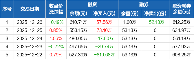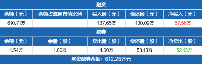 融資方面,當(dāng)日融資買入187.65萬(wàn)元,融資償還130.09萬(wàn)元,融資凈買入57.56萬(wàn)元。融券方面,融券賣出1萬(wàn)份,融券償還53.13萬(wàn)份,融券余量1萬(wàn)份,融券余額1.54萬(wàn)元。融資融券余額合計(jì)612.25萬(wàn)元。