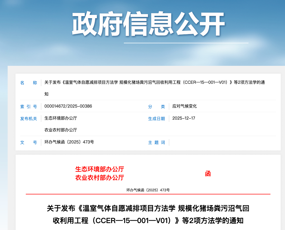 12月17日,生態(tài)環(huán)境部發(fā)布兩項CCER方法學,分別是“規(guī)?;i場糞污沼氣回收利用工程”和“農業(yè)廢棄物集中處理工程”。值得一提的是,截至目前(12月20日),生態(tài)環(huán)境部已在本月新發(fā)布了5項CCER正式方法學。至此,我國已有14項正式方法學,市場擴容速度明顯加快。