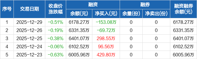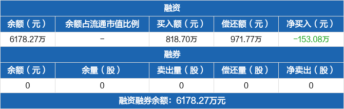 融資方面,當(dāng)日融資買入818.7萬元,融資償還971.77萬元,融資凈償還153.08萬元。融券方面,融券賣出0份,融券償還0份,融券余量0份,融券余額0元。融資融券余額合計6178.27萬元。